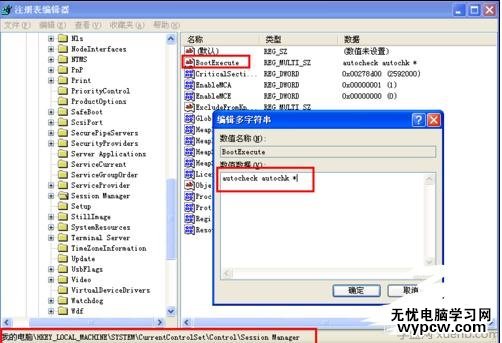 依次展開“HKEY_LOCAL_macHINE ”→“SYSTEM ”→“CurrentControlSet ”→“Control ”→“SessionManager ”,在右側找到BootExecute項,雙擊將其值設置為“ autocheck autochk *”。 經過這樣設置以后,如果電腦出現藍屏,將會在電腦重啟后自動運行自檢程序,試圖對系統中存在的錯誤進行修復。