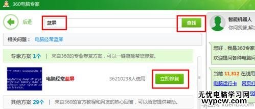 打開360電腦專家,輸入問題“藍屏”并點擊“搜索”按鈕,然后在搜索結果頁面中點擊“電腦經常藍屏 立即修復”按鈕。