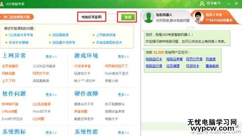 打開“360安全衛士”,點擊主界面中的“電腦專家”,在打開的“360電腦專家”窗口中,在搜索框中輸入“電腦經常藍屏”并點擊“搜索”按鈕,