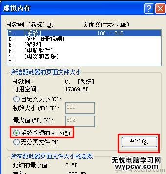 在此界面中,通過將各個盤上的虛擬內存大小設置為“系統管理的大小”并點擊“設置”按鈕。設置完成后,點擊“確定”按鈕。最后重啟一下電腦讓設置生效。