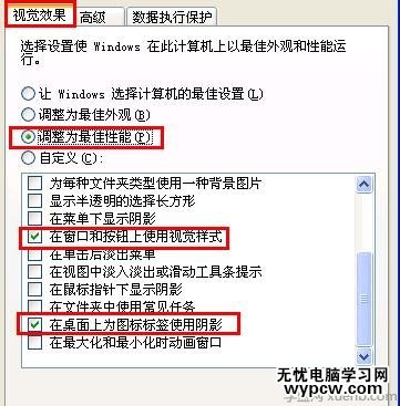 在打開的“性能選項”窗口中,切換至“視覺效果”選項卡,勾選“調整為最佳性能”,同時為了視覺上的友好,可適當勾選部分選項。