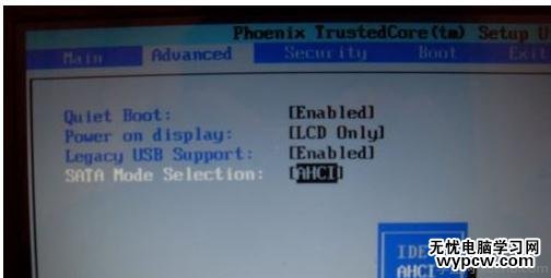 在此時(shí)的界面,我們看到要修改的SATA Mode Selection。如果現(xiàn)實(shí)IDE,那么我們修改成ACHI模式。