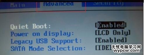 按向右的方向鍵“->”,此時(shí)會(huì)選中“Advanced”菜單。如下圖二。