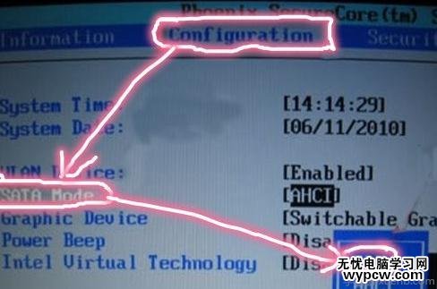 進入BIOS后在出現(xiàn)的界面找到“Configuration”選項單擊,用上下箭頭切換到“SATA MODE”,回車選擇“IDE或者ATA”。