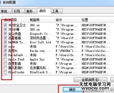 切換至“啟動”選項卡,然后禁用部分隨系統啟動程序或全部,最后點擊“確定”按鈕重啟電腦。