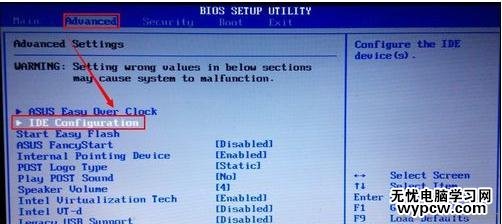 開機按【F2】進入Bios,進入以后鍵上的右鍵移動到Aduanced處,再點擊如下圖所示的地方。