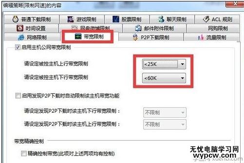 在策略編輯界面中,切換到“寬帶限制”選項卡,在此就可以對主機聯網速度進行限制啦。