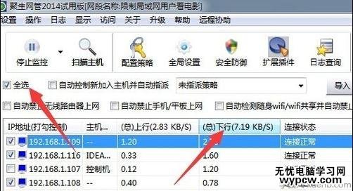 勾選“全選”項,這樣就可以查看當前計算機使用網絡情況,從中找到占用網速資源較大的計算機,雙擊創建一個新策略。
