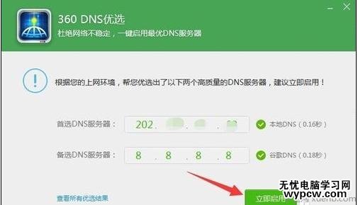 待檢測完成后,將彈出如圖所示的“推薦DNS”界面,直接點擊“立即應用”按鈕,即可使用最優DNS設置。這樣就可以大大提升網速的穩定性。