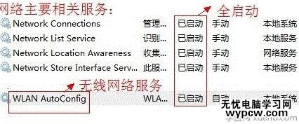 在服務中,我們重點檢查這四項?a href=http://www.xuenb.com/web/aspx/ target=_blank class="infotextkey">.network Connections、Network List Service、Network Location Awareness、Network Store Interface Service以及WLAN AutoConfig無線相關的服務是否被禁用,如果禁用了,在其上右鍵,選擇開啟即可,如下圖所示:
