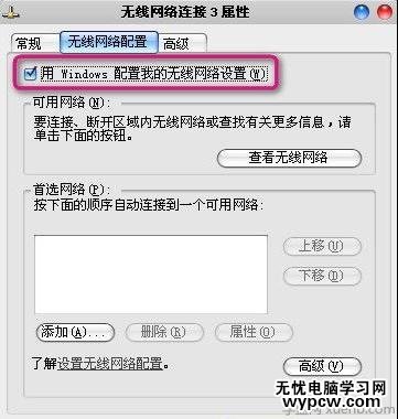 右鍵單擊“無線網絡連接”,圖框中有三個選項卡,分別是“常規”、“無線網絡配置”和“高級”,進入“無線網絡配置”選項卡,在“用Windows配置我的無線網絡設置”前的框中打勾,然后點擊“確定”。
