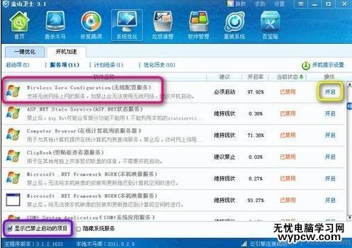 第一步:如果點擊刷新網絡列表時出現“Windows無法配置此連接”的提示,則打開金山衛士的“系統優化”功能,點擊“開機加速”選項卡,點擊“服務項”,選中左下角的“顯示已禁止啟動的項目”,然后在列表中找到“Wireless Zero Configuration(無線配置服務)”,點擊右側的“開啟”即可。然后在開始-運行中,輸?a href=http://www.xuenb.com/web/aspx/ target=_blank class="infotextkey">.net start wzcsvc,回車即可。筆記本無線網絡連接不上的癥狀即可解決。