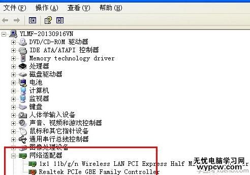 在設備列表中,查看網絡適配器是否安裝及其啟用。如果前面標識為綠色標識安裝成功且啟用,如果前面圖標有紅叉,表示網卡未啟用,如果前面圖標為問號或者感嘆號,標識驅動未安裝成功。