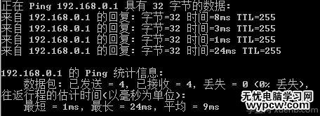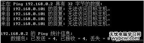 2.還是在黑色的窗體內(nèi)輸入第三個命令 ping 192.168.0.1 然后回車。注意192.168.0.1是我們剛才在窗體上看到的網(wǎng)關(guān)地址。如果出現(xiàn)無法訪問目標(biāo)地址,那么說明網(wǎng)關(guān)(可能是ADSL沒有撥號成功,也可能是路由器沒有正常啟動。基本上是網(wǎng)線連接有問題,或者是路由器等設(shè)備沒有正常開啟。可以試著把網(wǎng)線重安好,試著把路由器重啟動。有問題時的圖如下: