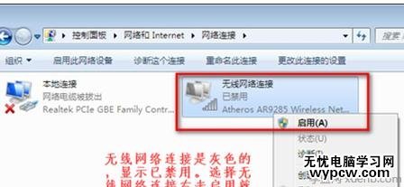 3、接著在打開的“網絡連接”窗口中,如果網絡連接里面有無線網絡連接是灰色情況,我們就鼠標右擊它選擇“啟用”;