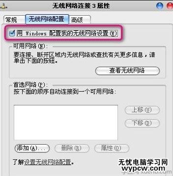 第三步:如果開關打開但仍然搜不到無線網絡,右鍵點擊右下角托盤處無線網絡圖標,點擊“打開網絡連接”,再右鍵點擊打開窗口中的無線網絡圖標,點擊“屬性”,點擊“無線網絡配置”選項卡,在“用Windows配置我的無線連接設置”前打勾后“確定”,再次打開“查看可用的無線連接”查看是否可以。