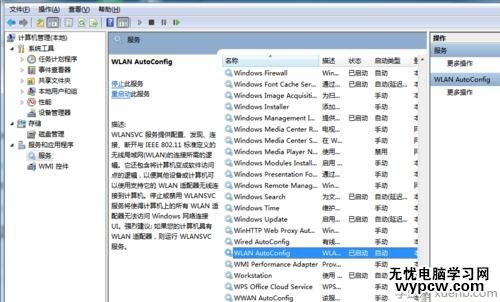 3、接著我們右擊桌面“計算機”圖標,選擇“管理”,左側有個“服務和應用程序”點開后有個“服務“,里面有個WLAN AutoConfig的服務,是否啟用了? 如果沒有啟用,則雙擊,然后啟用。如圖。