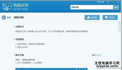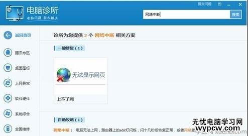 在騰訊電腦管家的電腦門診頁面中,找到搜索功能輸入網(wǎng)絡(luò)中斷,進(jìn)行搜索相關(guān)的解決方案,按回車即可搜索。