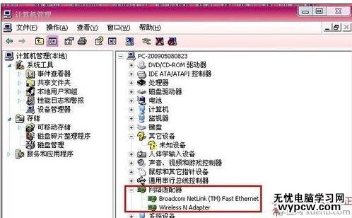 在設備管理器當中查看無線網卡驅動是否安裝成功以及無線網卡是否已經啟動。可以到設備管理器里去查看,右鍵選擇“我的電腦”,選擇“管理->設備管理器",在網絡適配器那里,沒有紅叉和黃色的問號,表示網卡驅動安裝成功,而且已經啟動。