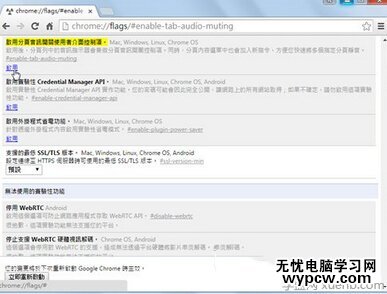 開啟Google chrome瀏覽器,在上方網(wǎng)址列輸入「chrome://flags/#enable-tab-audio-muting」,按下〔enter〕鍵后會(huì)跳至設(shè)定頁面,找到其中的「啟用分頁音頻開關(guān)用戶接口控件」。