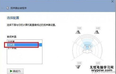 8、從打開的“揚聲器配置”界面中,點擊“音頻聲道”下拉列表,從中設置“立體聲”或“四聲道”來嘗試解決問題;