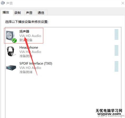 6、從打開的“聲音”設置窗口中,切換到“播放”選項卡,將“默認播放設備”設置為“揚聲器”,點擊“確定”完成設置;