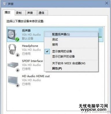 7、如果無法解決聲音問題,則可以右擊“揚聲器”圖標,從其右鍵菜單中選擇“配置揚聲器”項;
