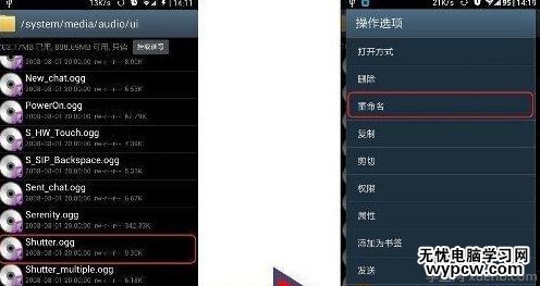 第三步、進入/system/media/audio/ui目錄找到里面的文件Shutter_01.ogg,長按文件選擇重命名,把.ogg后綴去掉即可;