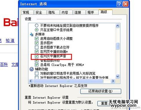 2、既然提到了瀏覽器,那么就不得不提下IE了,作為老牌的瀏覽器,現(xiàn)在仍然保留著眾多的用戶群,而且很多瀏覽器也是基于IE內核的。在IE的高級選項中有一個多媒體選項,其中就有一項是控制網(wǎng)頁聲音的,如果未勾選,那么基于IE內核的所有瀏覽器均不會聽到任何聲音,默認自然是勾選的,但是以防萬一還是查看下為好。
