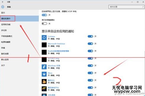 7、進入系統界面后 點擊“操作和通知”把網頁往下拉 看是否是軟件的聲音被關閉了 如果關閉了點擊 打開 即可