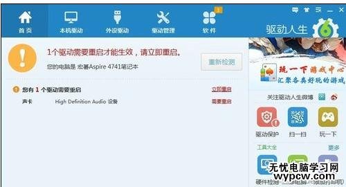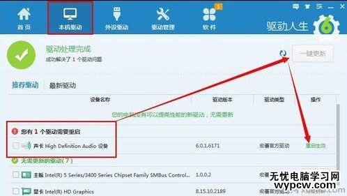 小編此處強調,因為驅動人生是一種專業配置電腦驅動的軟件,當驅動人生自動檢測了電腦版本,就會給你自動推薦安裝該品牌電腦的官方版本。如果是用戶自己網上下載,還說不定是雜牌。找到聲卡,選擇一鍵更新,更新后,選擇立即重新啟動。