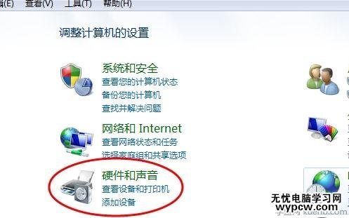 在彈出的對話框里點擊“硬件和聲音”選項進(jìn)入下級頁面;