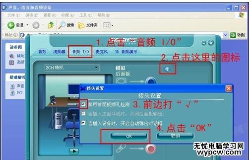 進入“Realtek高清晰音頻配置”后,選擇“音頻 I/O”選項卡,點擊“模擬后面板”右側的設置圖標,之后在彈出的“接頭設置”面板中,在“禁用前面板插孔檢測”打√,點擊“OK”,再點擊“OK”,如下圖: