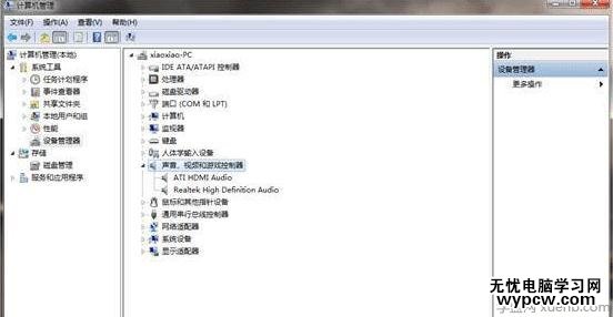 第二步,打開“設備管理器”,查看“聲音、視頻和游戲控制器”目錄。通常,你會發現設備顯示不正常。如下圖,Realtek High Definition Audio正常,但是ATI HDMI Audio一欄卻標有黃色嘆號。