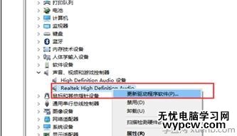 在設(shè)備管理器中,我們雙擊打開聲音設(shè)備,然后在所列的硬件中擊右鍵,選擇“更新驅(qū)動(dòng)程序”。