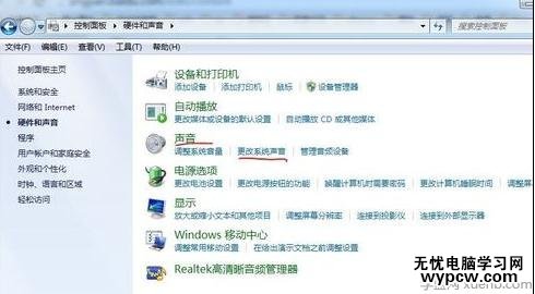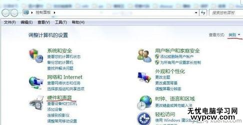 打開控制面板,選擇硬件和聲音