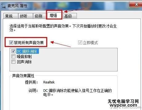 2在“麥克風屬性”窗口切換到“增強”選項卡,然后勾選“禁用所有聲音效果”復選框,最后單擊“確定”按鈕保存修改。
