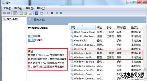 ②:檢查windows audio服務是否正常,在開始按鈕的搜索框中輸入services.msc按回車鍵打開“服務”框,在右側找到Windows Audio服務,將狀態選擇啟動,啟動類型選擇自動,如圖6所示: