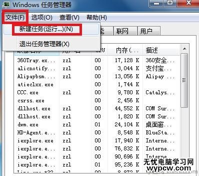 在進(jìn)程頁面,選擇文件--新建任務(wù)運(yùn)行,如下圖所示!