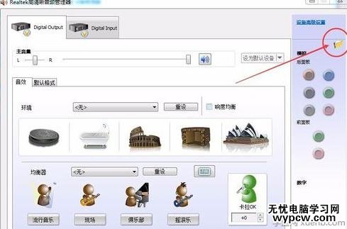 到這里就可以看到音頻管理器的設(shè)置界面了,這里因為設(shè)置的地方只是一個小圖標,沒有設(shè)置過還不容易發(fā)現(xiàn)它,找到靠右上邊的像個文件夾一樣的圖標,點擊它。