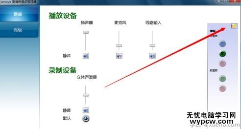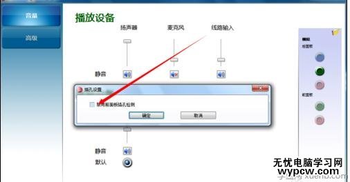 打開“高清晰音頻管理器”之后,會出現一個設置界面,在右上角有個和文件夾圖型差不多的,打開之后選擇“禁用前面板插口檢測”打鉤,然后確定就可以了。完成以上操作可以正常使用前置音頻插口了。具體操作如下圖: