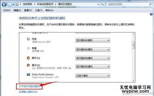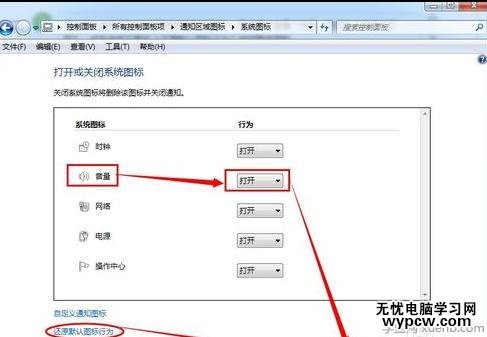 您也可以選擇下方的"打開或關閉系統圖標",再選擇“音量”欄目,在行為上選擇“打開”。或許選擇下面的“還原默認圖標行為”找回聲音圖標。