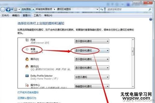 在彈出的窗口上,選擇音量圖標,在選項里選擇“顯示圖標和通知”。