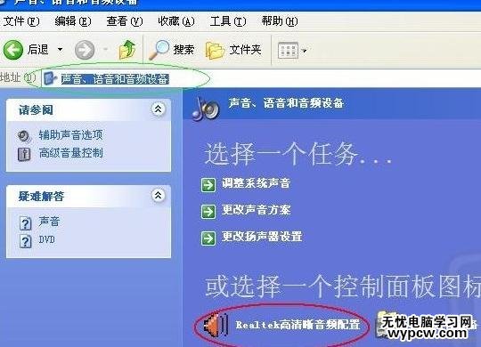 1.從簡單入手,先檢查是否禁用了“前面板檢測”功能,進入電腦桌面左下角的開始-控制面板-選擇“聲音、語音和音頻設備”-“Realtek高清晰音頻配置”。