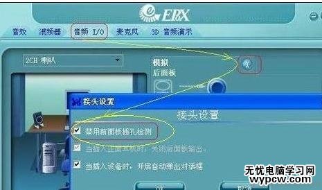 首先切換到“音頻I/O”選項,然后在“模擬后面板”右側有一個設置工具,點擊進入設置之后,在彈出的面板中將“禁用前面板檢測”前面的勾打上即可,之后選擇OK確認即可。