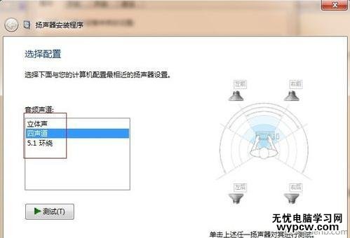 在打開的“揚聲器”中,選擇不同的音頻頻道,測試聲音。(這個時候要把耳機插在主機前邊的耳機孔中),找到一個有聲音的音頻頻道,點擊下一步,完成即可。