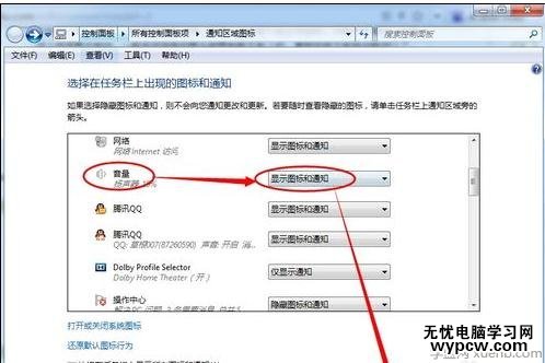 在彈出的窗口上,選擇音量圖標,在選項里選擇“顯示圖標和通知”。