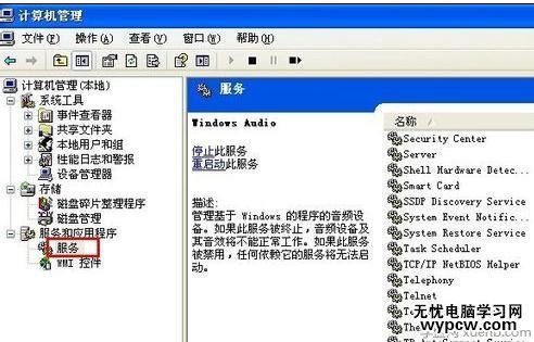 服務(wù)未運(yùn)行:這個應(yīng)該是很多用戶容易忽略的問題,那就是關(guān)閉了音頻服務(wù)。當(dāng)然可能并非是你有意關(guān)閉,而是在進(jìn)行開機(jī)優(yōu)化的時(shí)候把它給禁止了,這樣導(dǎo)致的后果就是開機(jī)并沒有啟動音頻服務(wù),因此電腦沒有聲音。解決辦法很簡單,讓開機(jī)自啟動音頻服務(wù)即可。具體執(zhí)行方法是,右擊我的電腦,點(diǎn)擊管理,找到服務(wù)選項(xiàng),雙擊進(jìn)入,找到windows Audio選項(xiàng)看它是否開啟了,如果沒有,把它開啟并設(shè)為自動。