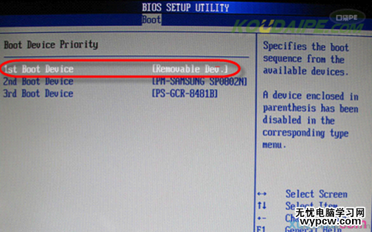 將U盤為BIOS設置啟動設備“1st Drive”以后,回到Boot Device Priority界面時第一啟動項就變為您的U盤了,點擊F10保存bios設置U盤啟動就完成了,重啟電腦就可以進入口袋PE界面進入完成U盤裝系統工作。如圖四