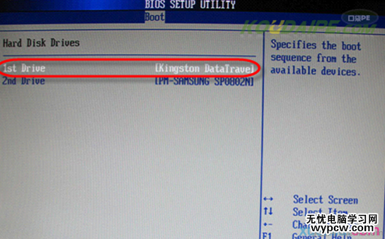 在硬盤驅動器“Hard Disk Drives”界面中,選擇U盤為第一啟動設備“1st Drive”。如圖三